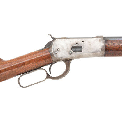 .25-20 Winchester. 24" octagonal barrel. SN: 601808 (mfg. ca. 1911). Blued finish, steel furniture, varnished smooth walnut stock with crescent butt and smooth forend. Lever action tubular magazine fed rifle with elevation adjustable buckhorn rear sight and dovetailed front sight blade. Standard Winchester markings and proofs. {C&R}