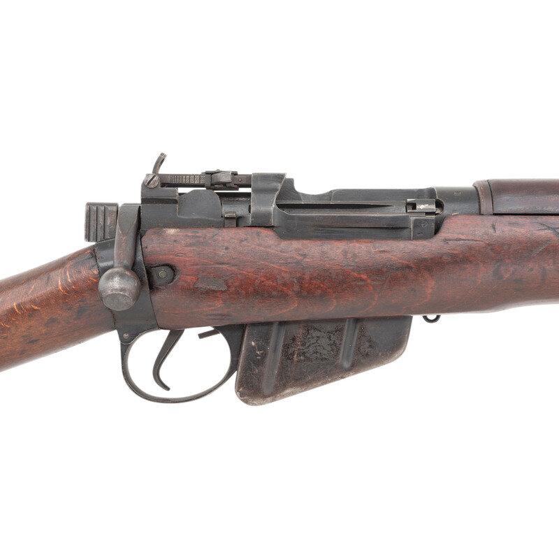 .303. 25.2" barrel length. SN: BI 10760. Parkerized and Suncorite painted metal finish with polished bolt body mounting walnut semi-pistol grip stock with full length upper handguard. Bolt action repeating rifle fed by semi-detachable ten-shot magazines charged with stripper clips. Left receiver is marked No4MKI F (FTR) above the original model marking No4MKI, indicating it went into factory thorough repair at ROF Fazakerley. Rifle mounts a stamped MK/3 marked rear sight with the aperture bent. Date mark to left action body of 1943. Proof marking to right receiver is worn down, as are those on the wrist. Stock has been sanded. No externally visible importer markings on action body or muzzle. Lacks sling loops. Nonmatching serial numbers. {C&R}