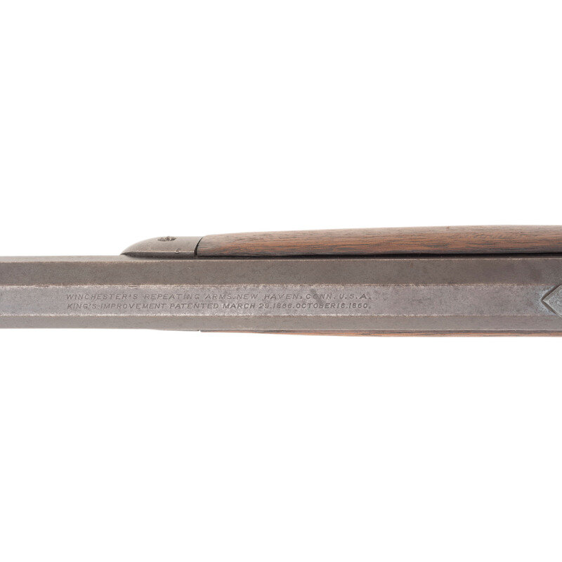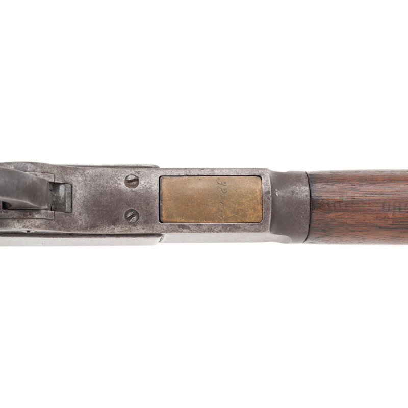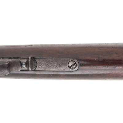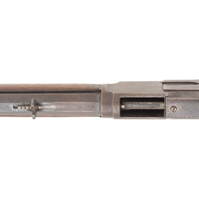 .32-20. 24" octagonal barrel. SN: 624500B (mfg. ca. 1909). Blued finish, color casehardened hammer and lever, brass cartridge lifter, smooth walnut straight grip stock with crescent butt and smooth forend. Lever action repeating rifle with tubular magazine, buckhorn rear sight and dovetailed front sight blade. Two-line Winchester address and patent markings on barrel, Winchester proof on barrel, forward of receiver, along with caliber marking, which is also present on the bottom of the lifter. {C&R}