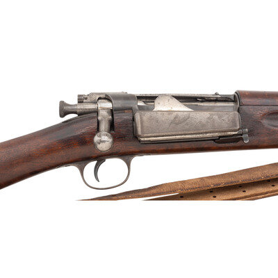 .30-40 Krag. 30" barrel length. SN: 165800. (Mfg ca 1899) Blued finish with polished bolt and nitre blued small parts mounting walnut straight wrist stock with half length upper handguard. Bolt action internal magazine fed repeating rifle loaded through trapdoor to right receiver. Item mounts model 1898 pattern rear sight paired with a pinned front blade. Left receiver is marked U.S./MODEL 1898. SPRINGFIELD ARMORY. followed by the serial number. Stock sanded with weak circle P to wrist and some remnants of cartouche border to left wrist. Item mounts a leather model 1907 pattern sling. {C&R}