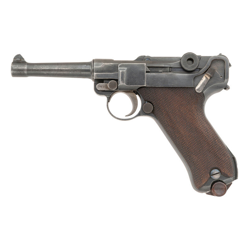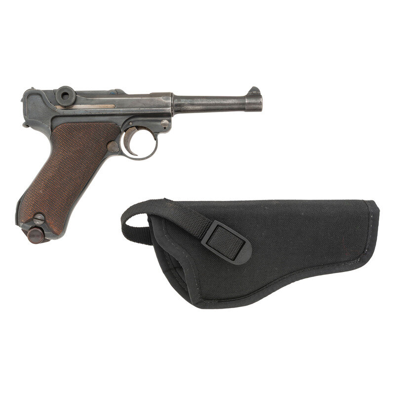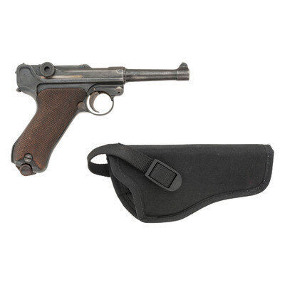 9mm Para. 3.9" barrel length. SN: 7654c. Blued metal refinish with straw colored small parts and polished internal surfaces mounting checkered walnut grips. Short recoil operated toggle locked autoloading pistol fed by detachable single stack magazines. Toggle link shows the DWM maker mark with no date on the barrel extension. Barrel shows an 8,82 bore gauge mark followed by MADE IN GERMANY exporter mark, in addition to the Imperial German {Reichsadler} and Gothic letter mark. Barrel extension and breechblock struck with {Crown/N} commercial proof marking. Serial numbers are mixed, with only the non matching barrel showing military inspection markings. Comes with one commercial wood base plug magazine with GERMANY struck into the plug. Additionally accompanied by a nylon Uncle Mike's Sidekick holster. {C&R}