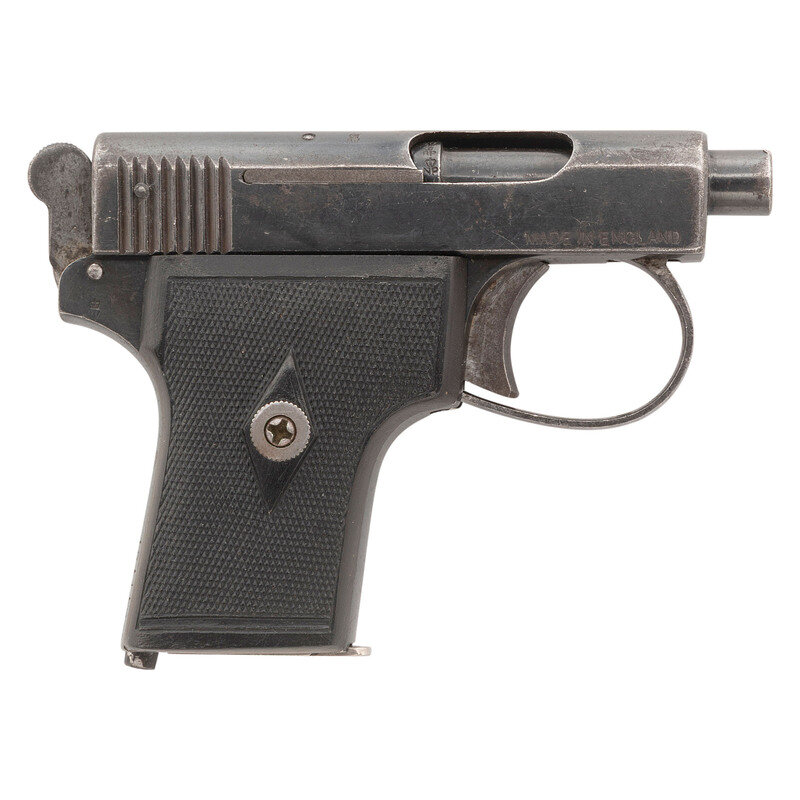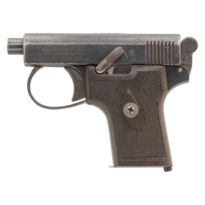 .25 ACP. 2.125" barrel length. SN: 151116. Blued finish with small parts left in the white mounting checkered hardrubber grips with diamond patterns around escutcheons. Single action simple blowback operated autoloading pistol fed by detachable single stack magazines. Left slide shows maker marking WEBLEY & SCOTT LTD/LONDON & BIRMINGHAM/6.35 M/M AUTOMATIC PISTOL with SAFE mark over the manually operated safety lever, and Webley & Scott flying bullet logo. Right slide marked MADE IN ENGLAND. {C&R}