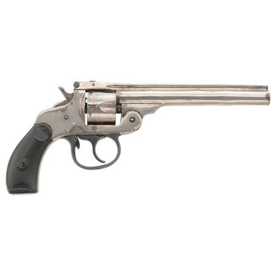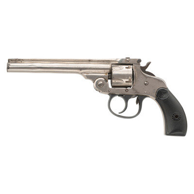 .32 S&W. 5" barrel length. SN: 375098. Nickel plated finish with blued small parts mounting checkered hardrubber grips with H&R Target logo. Double action five-shot top-break revolver mounting front blade and rear latch notch sights. Standard make and model markings. The barrel has bulged in two places. {C&R}