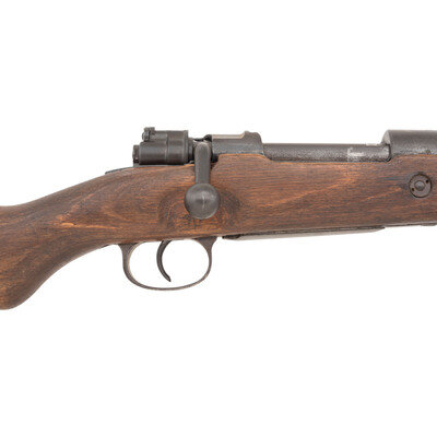 7.92x57mm. 24" barrel length. SN: 3011. Blued metal finish set in wood semi pistol grip stock and mounting adjustable rear notch and inverted V front sights. Bolt action rifle with internal magazine fed by stripper clips. Top of receiver has been struck with the bnz manufacture code representing Steyr-Daimler-Puch AG. Left side of receiver struck with Mod. 98. Item is missing the bayonet lug and spring for the barrel band. {C&R}