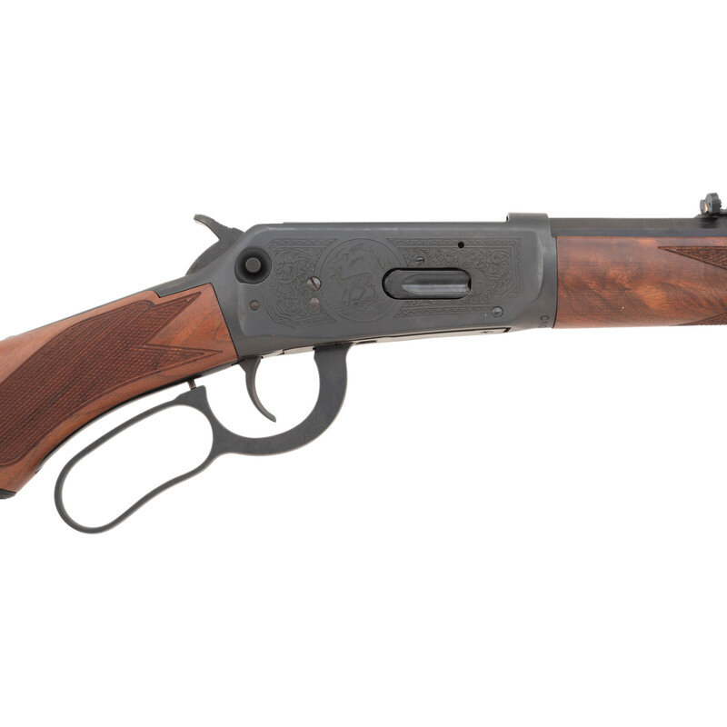.30-30. 26" barrel length. SN: CN00100. Blued metal finish with polished locking block, octagonal to round barrel, half length magazine tube, and semi-pistol grip walnut stock with with machine checkering. Lever action repeating tube magazine fed rifle commemorating the 100th year of Winchester Model 94 production. Receiver has been laser engraved and mounts a crossbolt safety mechanism. Sights consist of semi buckhorn rear notch and front brass bead. Comes in original cardboard box. {MODERN}