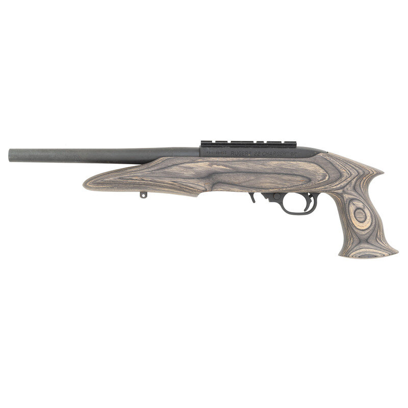 .22 LR. 10" barrel length. SN: 490-09012. Black Anodized receiver with Parkerized barrel set in laminated wood stock with 4.5" weaver rail to the top of the receiver and no iron sights. Simple blowback operated semi-automatic pistol fed by detachable rotary magazines. Item shows standard make and model markings. Comes in original cardboard box with RUGER branded soft case, detachable bipod, one ten shot magazine, and one PROMAG drum. {MODERN}