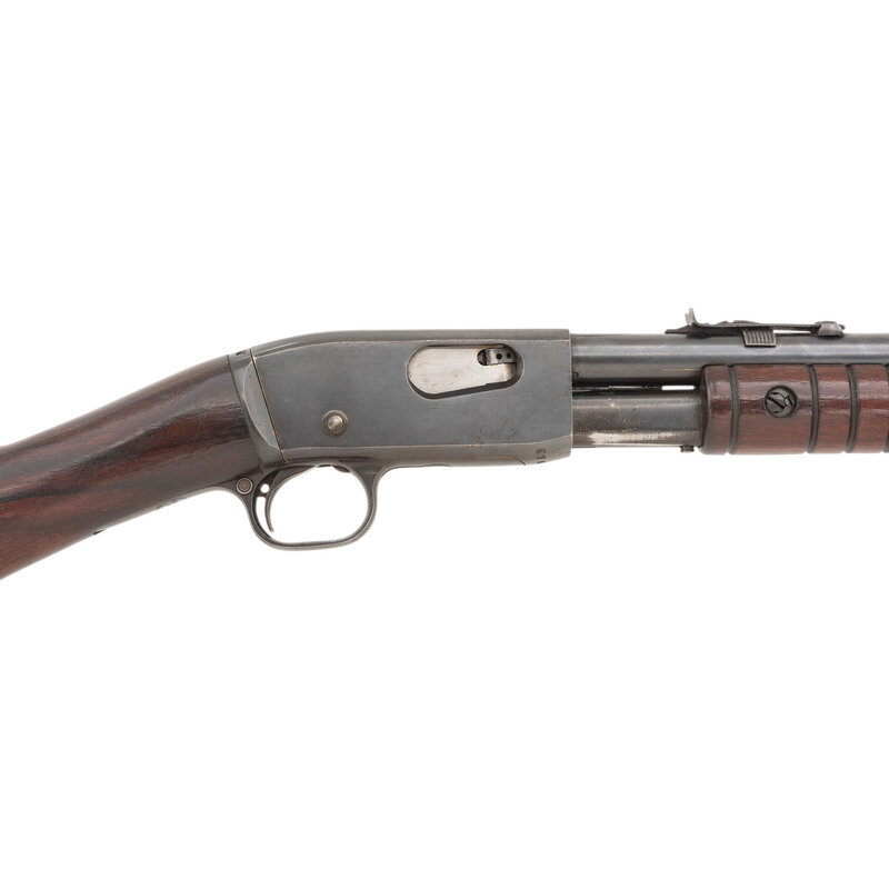 .22 short/long/long rifle. 22" barrel length. SN: 579065. Blued metal finish with polished wood stock and pump. Slide action operated repeating rifle charged by tubular magazine mounted with rear notch and front bladed sights. Top of barrel marked with MODEL 12-A followed by Remington address marking and patent dates. Remington logo stamped on barrel behind rear sight near receiver. Tang features REMINGTON/UMC marking. {C&R}