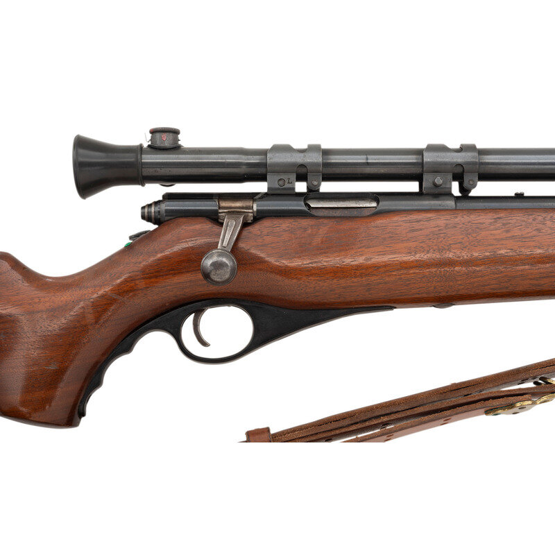 .22 S/L/LR. 26" barrel. NSN. Blued metal finish with polished bolt in walnut semi pistol grip stock with synthetic triggerguard and buttplate mounting MOSSBERG-NO.M4c/4 POWER PATENTED. Bolt action tube magazine fed repeating rifle charged from the front of the tube. The front sight and rear sight have been dismounted. Standard make and model marks to barrel. Mounts a Pattern of 1907 sling fitted two sling loops on toe and forend. {C&R}