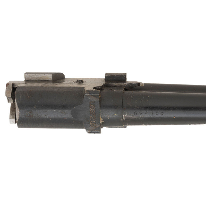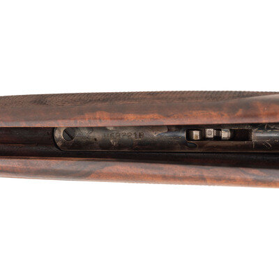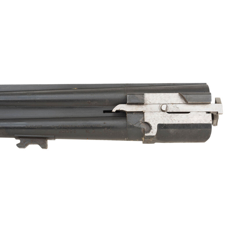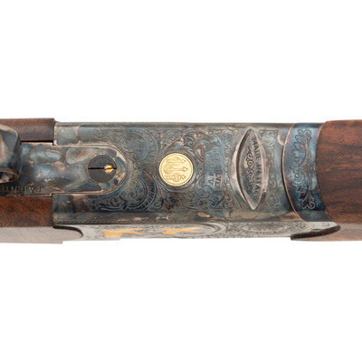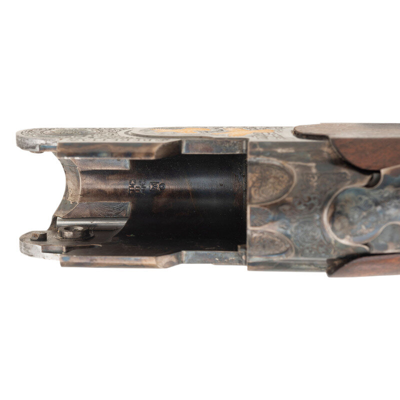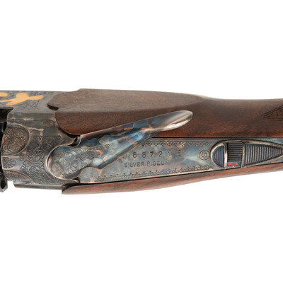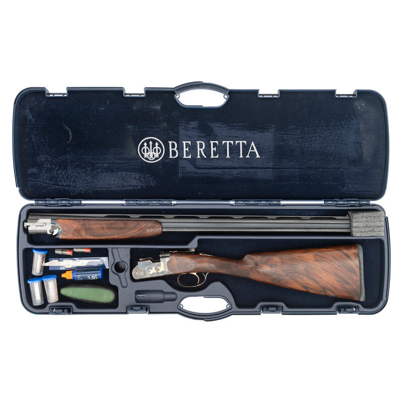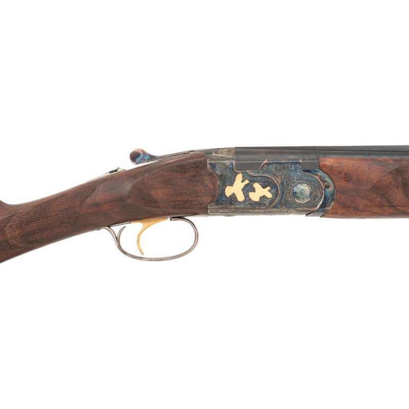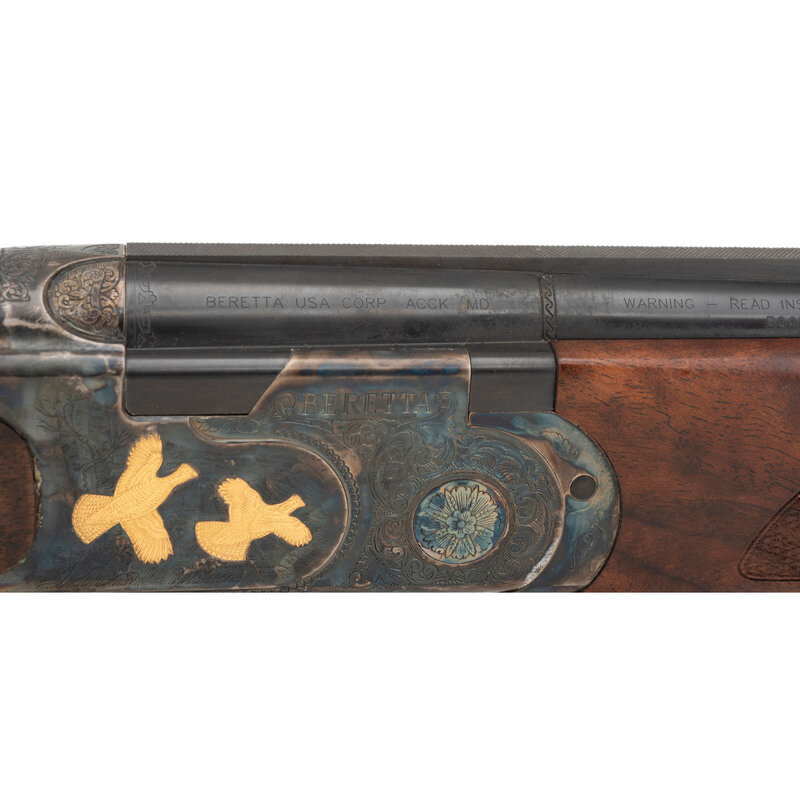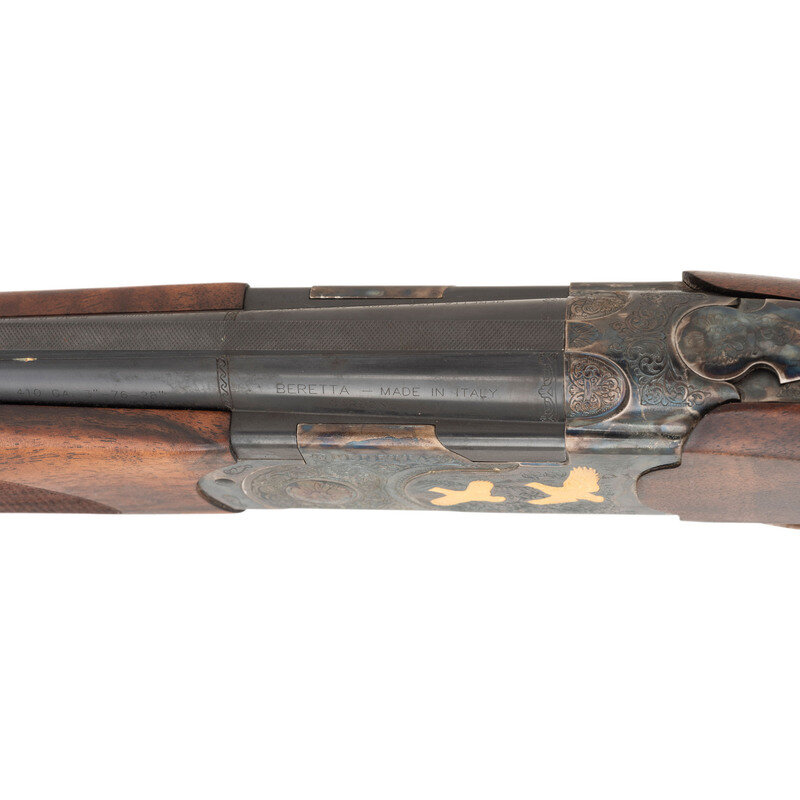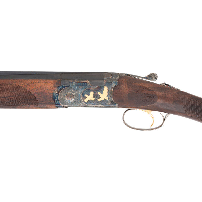 .410 Gauge. 28" barrel length. SN: U68721B. 3" chamber lengths. Mounts interchangeable chokes with Modified over Cylinder installed. Casehardened frame with balance of parts blued mounting checkered walnut straight English style stock, gold trigger, and gold inlaid patterns to engraved frame. Double barrel over/under boxlock ejector shotgun with full length matted and vented barrel rib mounting silver bead front sight. Features a single selective trigger and tang safety mechanism. Frame is richly engraved with spiral scroll engraving over a beaded ground, and gold game birds in flight over engraved vignettes. Item mounts a Beretta branded rubber recoil pad. Standard make and model markings including 687 SILVER/PIGEON V to the lower frame and SILVER PIGEON to tang. Italian smokeless powder firing proofs to major parts. Lower barrel marked EXCELSIOR - HIGH STRENGTH ALLOYED STEEL. Silver oval plate to toe is unsigned. Comes with its original blue synthetic travel case. Included with the shotgun are: a Beretta GEL-TEK recoil pad, sling swivel kit, two snap caps (one cracked), fiber optic front sight kit, three Beretta Chokes in F-*, IC-****, and IM-**, and the owner's manual. {MODERN}