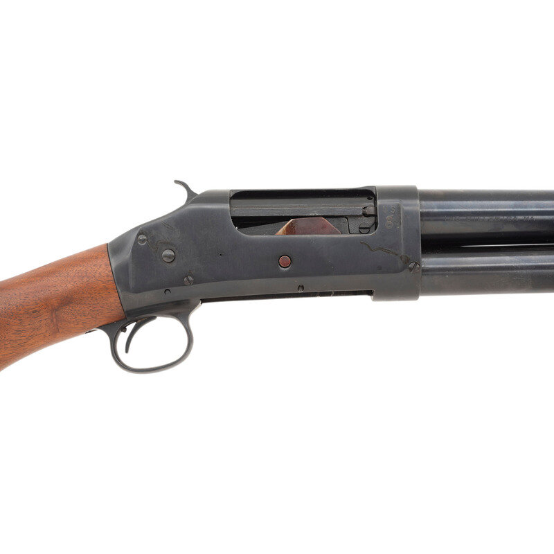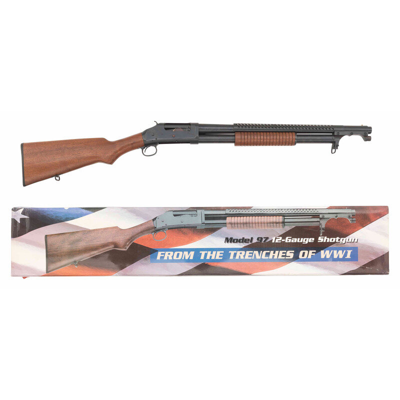12 Gauge. 20" barrel length. SN: B091173. 2.75" chamber length. Cylinder bore. Blued finish with plum blued small parts, walnut semi pistol grip stock with corncob forend, and mounting 6-row perforated heat shield and bayonet lug mounting front brass bead sight, with sling loops to bayonet lug and toe. Standard make and model markings including impersonation US/{Ordnance Bomb} on right receiver. Comes in original cardboard box. {MODERN}
