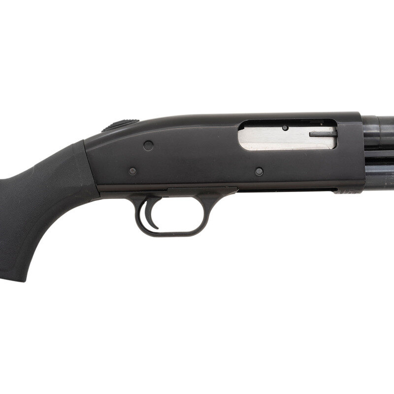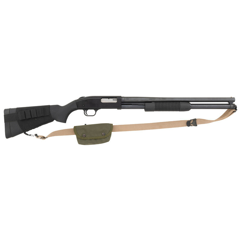 12 Gauge. 20" barrel length. SN: T584528. 3" chamber length. Cylinder Bore. Blued meta finish with black anodized receiver and polished bolt mounting black synthetic furniture including semi-pistol grip stock with recoil pad. Slide-action repeating shotgun with full length magazine tube featuring sling loop to tube plug and stock toe. Item shows standard make and model markings with brass bead front sight. Stock mounts an elastic shell holder, and a Nobuckl pattern sling with shotgun shell pouch. {MODERN}