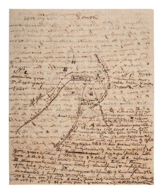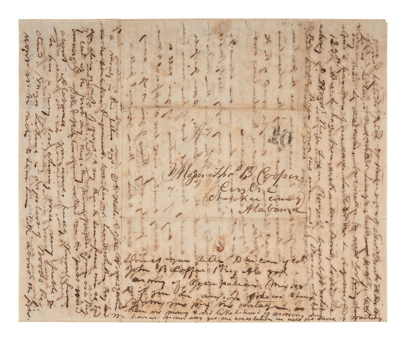 18.25" x 11.125". Letter from a soldier in the 1st Regiment Alabama Volunteer Army describing the Battle of Monterrey addressed to Major Thomas B. Cooper of Cherokee County, Alabama. Dated October 8, 1846, the letter includes a hand drawn map both in ink and pencil depicting the position of the forces of the United States along the St. John River three miles beyond its junction with the Rio Grande at Camargo. The letter alleges that the Alabama Volunteers fought valiantly, that the Texas Rangers only performed picket duties, and describes the losses suffered by the Tennessee, Baltimore, and Mississippi regiments in the battle itself. Further, the letter describes the desolate landscape in which its author found himself and the poor condition of a friend suffering from sickness. The map itself shows only the most basic disposition of Army units, and does not show the movement of the battle itself. An intriguing firsthand account of the Battle of Monterrey depicting a soldier's dislike both of the conditions in which the Army lived, and his unfamiliar surroundings in Mexico.