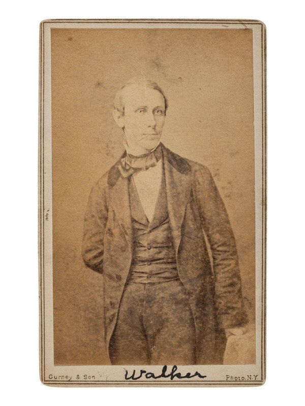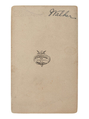 CDV on cardstock mount, standing portrait of William Walker, physician, lawyer, journalist, and mercenary who organized unauthorized military expeditions into Mexico and Central America with the intention of establishing colonies. Gurney & Son's studio imprint on mount recto and verso.