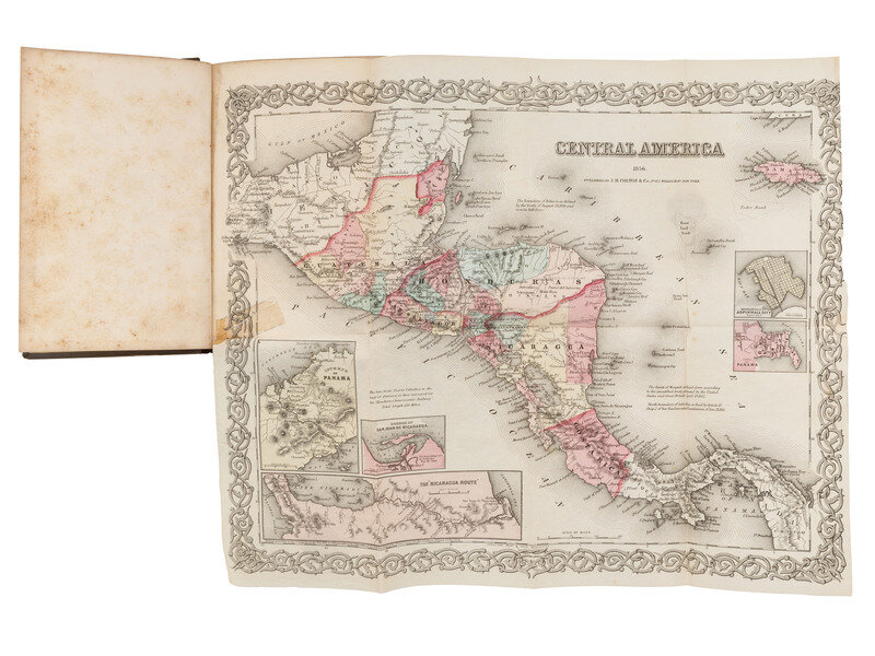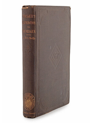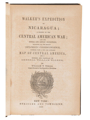 WELLS, William V. (1826-1876). Walker's Expedition to Nicaragua; A History of the Central American War; and the Sonora and Kinney Expeditions, Including All the Recent Diplomatic Correspondence, Together with a New and Accurate Map of Central America, and a Memoir and Portrait of General William Walker. New York: Stringer and Townsend, 1856. Frontispiece of Major General William Walker, vi, [11]-316 pp., FIRST EDITION of this "highly partisan defense of the filibusters' regime." Publisher's black cloth. Twice inscribed, "Gilbert B. Claiborne / July 1856 and "Gilbert Claiborne / Richmond July 1856." Large folding hand-colored map of "Central America / 1856" by J.H. Colton & Co. pasted down to front end paper. Map includes insets of the Isthmus of Panama and "The Nicaragua Route."