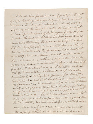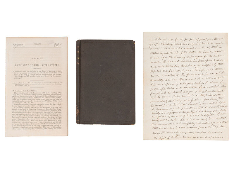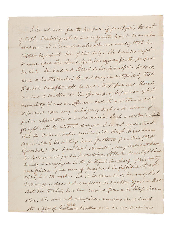 [With:] Incomplete, unsigned 2pp manuscript, 7 3/4 x 9 3/4 in., with Platner & Porter Congress stationers watermark (creasing, toning, approx. 1 in. tear in upper right quadrant running thorgh both pages). Seemingly pages from a draft speech intended for Congress and related to the Congressional investigations of the actions of Commodore Paulding with regard to William Walker's arrest. Excerpts include: "[Walker] sought to invade the country with an armed force - no matter what may have been his professions. He went there proclaiming himself a military chieftain - his business was war and not peace. His business was to usurp rights that did not belong to him and to obtain dominion over a country.... If we have done [Nicaragua] a wrong, when she presents her demand for redress, let us make a suitable atonement...."