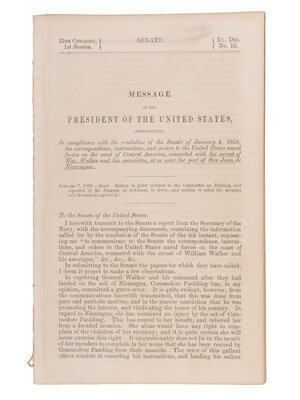 [With:] Message of the President of the United States, communicating, in compliance with the resolution of the Senate of January 4, 1858, the correspondence, instructions, and orders to the United States naval forces on the coast of Central America, connected with the arrest of Wm. Walker and his associates, at or near the port of San Juan de Nicaragua. Sen. Doc, 35th Congress, 1st session, Ex. Doc. No. 13.) 38pp, 5 1/2 x 9 in. (disbound, light soil first page top right). President James Buchanan transmits to the Senate a report from the Secretary of the Navy related to investigations into the lawfulness of William Walker's arrest by Commodore Hiram Paulding.