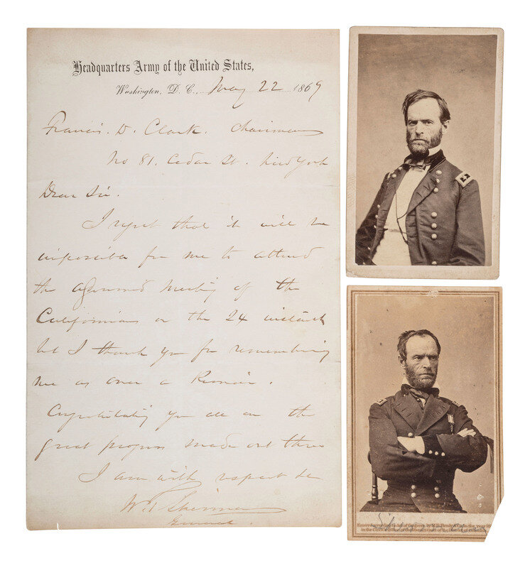 [SHERMAN, William T. (1820-1891)]. ALS as general, dated at Army Headquarters in Washington, 1869 and two CDV portraits from life.