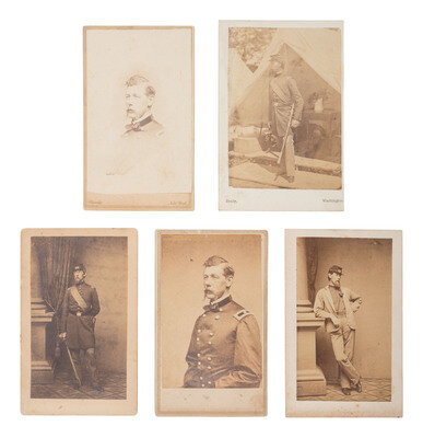 5 CDVs on cardstock mounts featuring portraits of Alexander Shaler taken throughout the Civil War. Cartes include: Vignetted portrait. New York: Brady. Autographed on verso, "Alexander Shaler." -- 2 standing portraits of Shaler while serving with the 7th NYSM, one in which he is shown smoking a pipe. Uncredited. -- Outdoor view of Shaler while with the 7th NYSM, taken at Camp Cameron. Washington, DC: Brady, April-June 1861. -- Seated view of Shaler as brigadier general. New York: J.W. Everett & Co., ca 1863-1865.