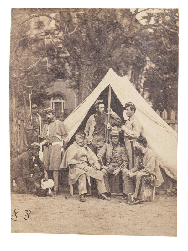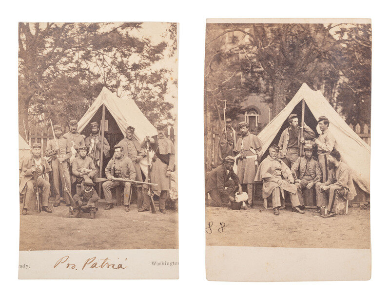 2 photographs, approx. 3 3/8 x 2 3/8 in., on cardstock mounts, including: Image capturing 8 members of the 7th NY State Militia posed before a tent, many armed. A young African American male subject is seated in front of the group and he appears to be shining a boot. Washington: Brady, 1861. The 7th NYSM's motto, "Pro Patria" ("For Country") is written on the mount below the image. Verso is signed and inscribed by Silas R. Brownell from "Camp Cameron, May 1861." -- Image of 7th NY State Militiamen congregating near a tent. A young African American man can be seen at left pouring a pitcher into a bucket. New York: G.N. Barnard & C.O. Bostwick, photographers, E. Anthony, publisher, 1861. -- Together, 2 photographs.