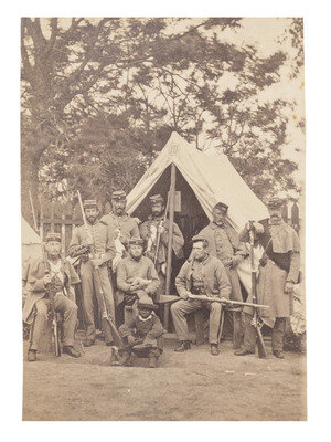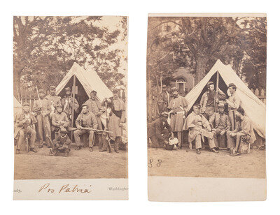 [CIVIL WAR]. 2 photographs of the 7th New York State Militia at Camp Cameron, incl. African American camp servants. Washington, 1861.