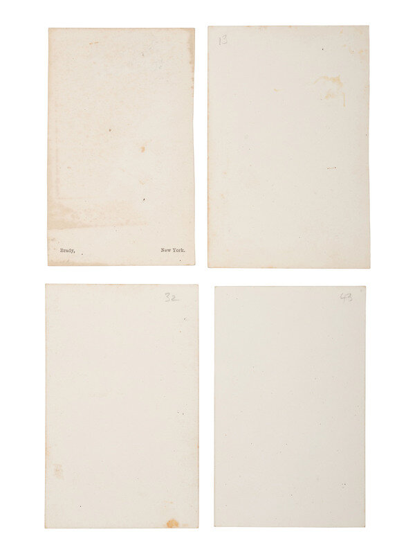 8 photographs, approx. 3 3/8 x 2 3/8 in. or smaller, on cardstock mounts. Four of the photographs bear the imprint of "Brady, Washington," on mount recto or verso. The remaining images were likely taken by Mathew Brady's studio, as well.