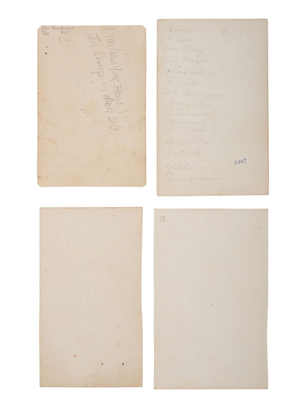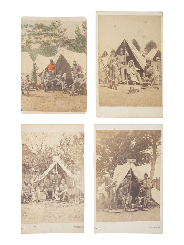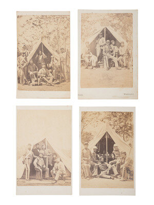 A remarkable selection of photographs of the 7th New York State Militia posed for group portraits at Camp Cameron, Washington, DC. Most of the subjects are unidentified, with the exception of a view of five men posed before a tent with the sign "Cosey-Nook," which includes Captain Henry C. Shumway.