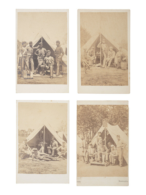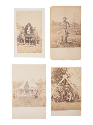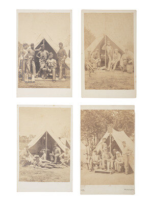 A remarkable selection of photographs of the 7th New York State Militia posed for group or individual portraits at Camp Cameron, Washington, DC. Most of the subjects are unidentified, with the exception of the following: View of a group of more than 15 men, including a member of the 7th NY artillery company. -- Five men posed before a tent, including Corporal Thomas R. Gooch, William H. Montayne, Corporal John H. Kemp, and Captain John Monroe. -- Two officers standing in front of a tent, including Lieutenant Charles Bostwick and Lieutenant Charles Babcock.