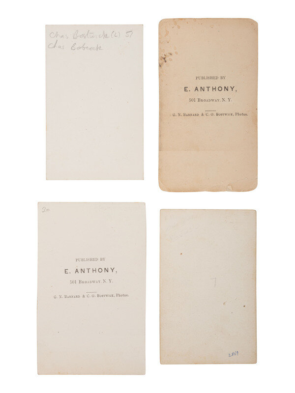 8 photographs, approx. 3 3/8 x 2 1/2 in. or smaller, on cardstock mounts. One photograph bears the imprint on mount recto of "Brady, Washington," and two bear the imprint on mount verso of G.N. Barnard & C.O. Bostwick, photographers, E. Anthony, publishers, New York. The remaining photographs are uncredited but may have been taken by Mathew Brady's studio.