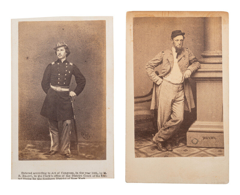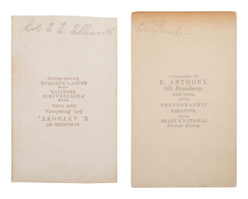 2 CDVs, including: Standing view of Noah Farnham in uniform. He appears to wear a black mourning band in honor of Elmer Ellsworth, the first conspicuous casualty of the Civil War and the first Union officer to die. New York: Brady, photographer, E. Anthony, publisher, 1861. -- Standing view of Elmer Ellsworth. New York: Brady, photographer, 1861. -- Together, 2 CDVs.