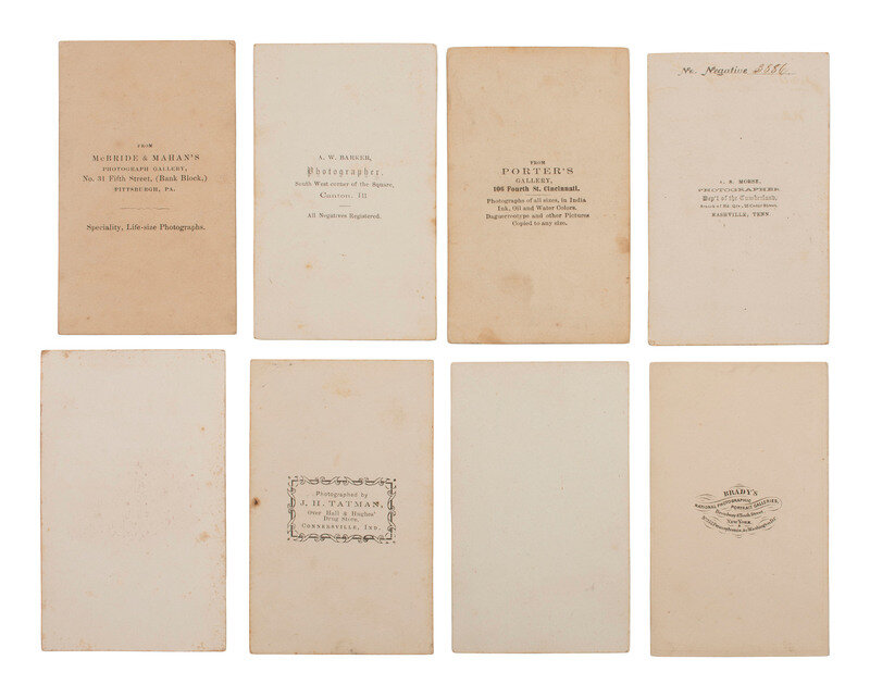 "The Castle" in Vicksburg, Mississippi, ca 1863. Corinth, MI: Armstead & Taylor. Credited and misidentified as "Castle Thunder" on verso. -- General James Birdseye McPherson in uniform. Uncredited, but believed to be by Mathew Brady ca 1863. Identified in ink on verso: "Maj Gen. McPherson, Comdg. Dept. Tenn." -- General Joseph Dana Webster in uniform. Uncredited but identified in ink on verso: "Gen. Webster, Chief of Gen. Sherman's staff." -- General Gordon Granger, in uniform. Uncredited but identified in ink on verso: "Maj Gen. G. Granger." -- General John E. Smith in uniform. Uncredited, but identified in pencil on image and verso. -- Lieutenant Colonel R. M. Sawyer in uniform. Uncredited but identified in ink on image and verso. -- General James Lowry Donaldson in uniform. Uncredited, but signed and identified in ink on image and mount recto. -- An illustration of General Rosecrans in uniform on horseback, lifting his hat. Uncredited but ink inscribed on verso: "Maj. Gen. Rosecrans / Photographed from a drawing of Brother Ally's." -- Captain and Assistant Quartermaster William Alonzo Wainwright in uniform. Uncredited, but signed by Wainwright on image. -- And 35 others, including 4 portraits of officers in uniform, a studio portrait of a trio of men, 2 of whom hold cigars, and a view of an ox cart pulling tree bark outside of a brick building. -- Together, 44 CDVs.