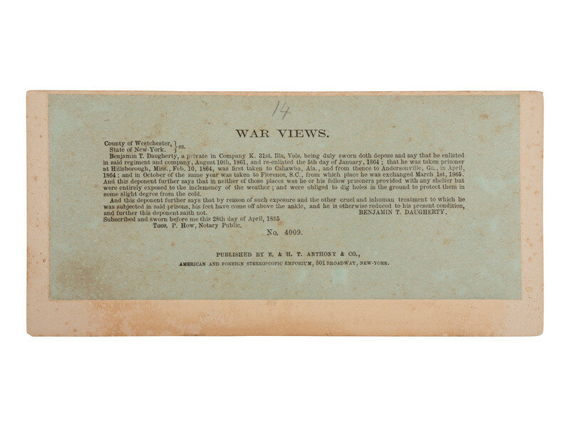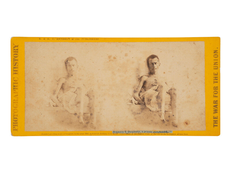 [CIVIL WAR]. Stereoview of Benjamin T. Daugherty, an Andersonville prisoner. New York: E. & H. T. Anthony & Co., 1865.