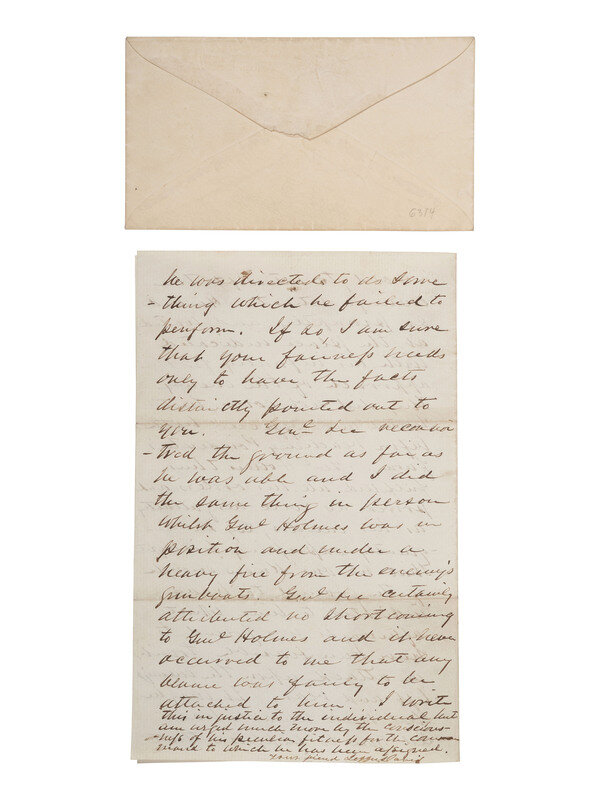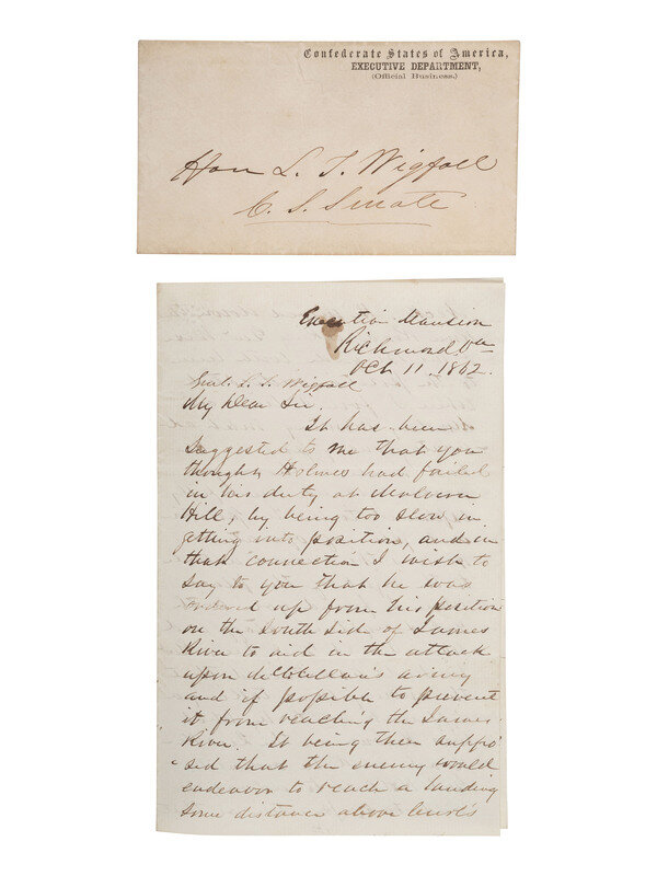 A substantive and fascinating letter from Jefferson Davis to the powerful Confederate States Senator the Hon. L.T. Wigfall of Texas (1816-1874), in which Davis tried to defend the conduct of his friend Confederate General Theophilus H. Holmes (1804-1880) from public criticism following the Battle of Malvern Hill which had been fought several months earlier (1 July 1862). Davis writes, in small part: "It has been suggested to me that you thought Holmes had failed in his duty at Malvern Hill, by being too slow in getting into position, and in that connection I wish to say to you that he was ordered up from his position on the south side of the James River to aid in the attack upon McClellan's army...." After discussing additional details of maneuvering, Davis concludes: "Genl. Holmes thus fulfilled all his orders....Genl. Lee reconnoitered the ground as far as he was able and I did the same thing in person whilst Genl. Holmes was in position and under heavy fire from the enemy's gunboats. Genl. Lee certainly attributed no shortcoming to Genl. Holmes and it never occurred to me that any blame was fairly to be attached to him...."