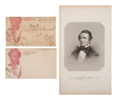 [With:] Two Civil war-date patriotic covers, both featuring a caricatured illustration of Louis Wigfall on the body of a stereotypical Indian with a tomahawk in hand and the caption: "Wigfall on his promised descent on Washington." The Union cover was a barb at the provincial culture of Texas. One cover is a soldier's letter sent by Nathaniel E. Pierson, Chaplain of the 89th New York Infantry. -- Engraving of Jefferson Davis.