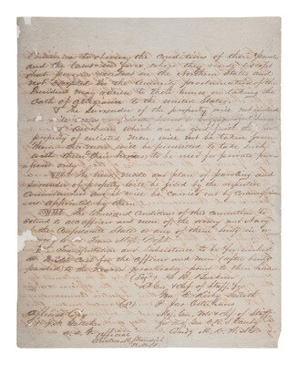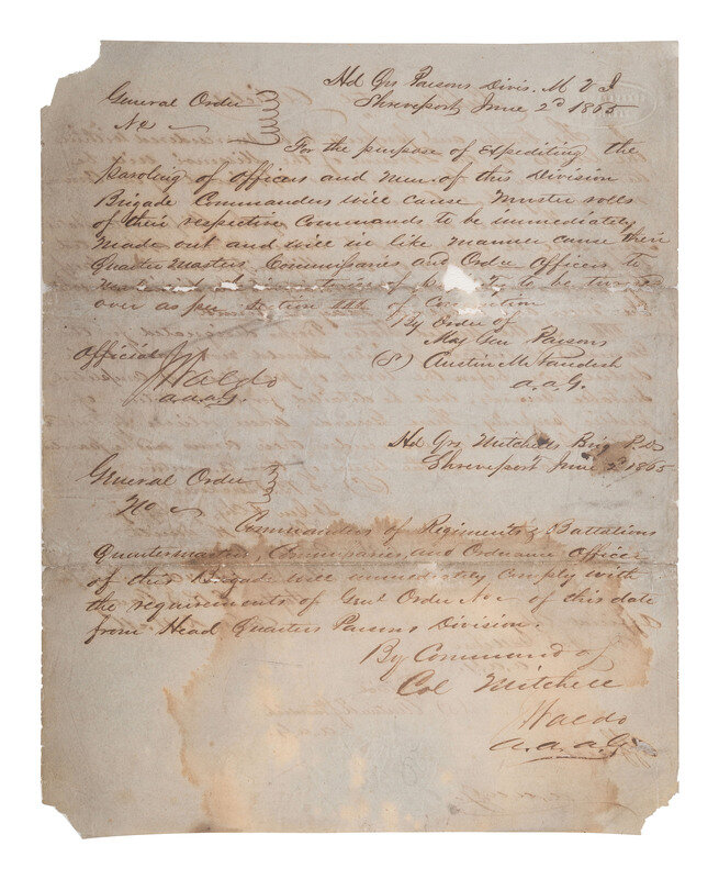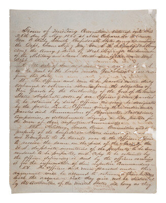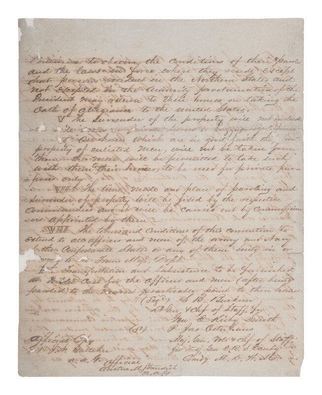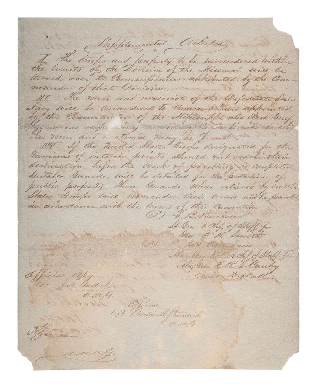 Manuscript "Terms of Military Convention entered into this 26th day of May 1865 at New Orleans La between Gen E. Kirby Smith Confederate States Army commanding the Dept, Trans Miss & Maj Gen. E.R.S. Canby US Army Cmg the Army & Div’s of West Miss’s for the surrender of the Military and Navel Authorities of the Trans Miss Dept." 4pp, almost entirely in secretarial hand, approx. 8 1/4 x 10 1/2 in. (toning, scattered losses affecting text in some places, large dampstain on pages 3 and 4, professionally conserved), stationer’s mark reading “Correspondencia Particulae.” An "Official Copy" secretarially signed by "S.B. Buckner," Lt. & Chief of Staff for Gen. E. Kirby Smith, and "P. Jas. Osterhaus," Maj. Gen. Vols. & Chf of Staff for Maj. Gen E.R.S. Canby Comdg M.D.W.M. Following the "Terms of Military Convention" are "Official" copies of related orders, including "Supplemental Articles" and two unnumbered "General Orders," both orders signed ("J. Waldo") by Jedidiah Waldo as AAAG, the last of which is dated 2 June 1865 at Shreveport, LA,