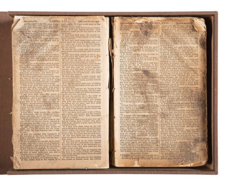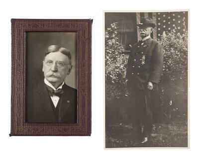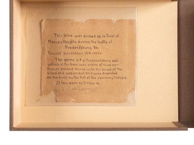 A preserved soldier's bible accompanied by a declaration signed by Dr. William F. Calhoun reading, "This Bible was picked up in front of Marie's Heights during the battle of Fredericksburg, Va. fought December, 13, 1862. The grime is the Fredericksburg soil which at the time was a skim of mud over frozen ground mixed with the blood of the killed and wounded and was deposited on the book by the feet of charging troops. It lay open as it now is." The note is written in ink and the signature of Calhoun in pencil. The bible itself has lost its jacket and the first 27 chapters of Genesis. Outer pages are stained with a layer of dirt deposited over them. Comes with one silver gelatin photograph of Calhoun in his GAR uniform, and a mounted silver gelatin portrait photograph of Calhoun in civilian dress many years after the war. Additionally comes with photocopies of Calhoun's muster rolls from his time with Company H of the 133d Pennsylvania Volunteers.
