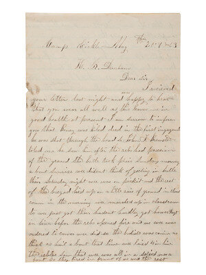 On Sunday morning, they marched up and when the Confederate soldiers began firing, Conklin's regiment was ordered to cover. He writes: "Wee [sic] did so the buliets [sic] was comin [sic] as thick as hail about that time wee laied [sic] 4 in line the rebles [sic] saw that wee was all in a solied [sic] mas [sic] a bout so they fired in frunt [sic] of us and the rest rest of the rebs swong [sic] rite [sic] around and they had us compleatley [sic] soroundied [sic] the buliets was comin in evry [sic] dericon [sic] wee was a bliged [sic] to fall back a wais [sic]."