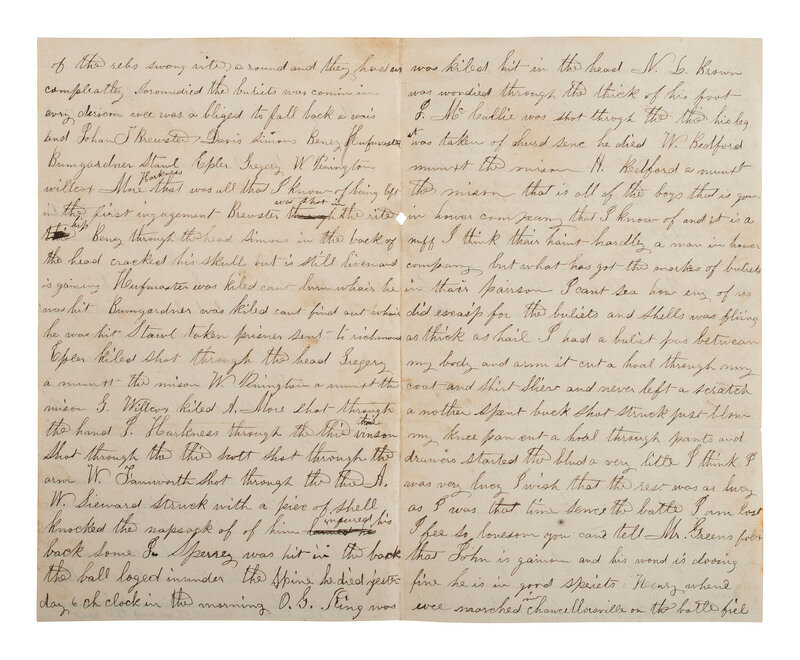 At the end of this long list, Conklin writes, "I think thair [sic ] haint [sic] hardly a man in hower [sic] company but what has got the markes [sic] of buliets in thair parrson [sic]. I can't sea [sic] how eny [sic] of us did escaip [sic] for the buliets and shells was fli'ing [sic] as thick as hail. I had a buliet pas [sic] betwean [sic] my body and arm it cut a hoal [sic] through my coat and shirt sliev [sic] and never left a scratch. A nother [sic] spent buck shot struck just blow [sic] my knee pan cut a hoal through pants and drawers started to bleed a very little I think I was very lucy [sic]." Conklin writes that in the time since the battle he has felt lost, and lonesome.