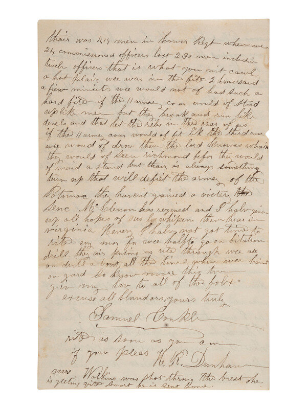 [CIVIL WAR]. Soldier's letter from Samuel Conklin, 141st PA Vols, recounting his and others' wounds sustained at the Battle of Chancellorsville. 20 May 1863.