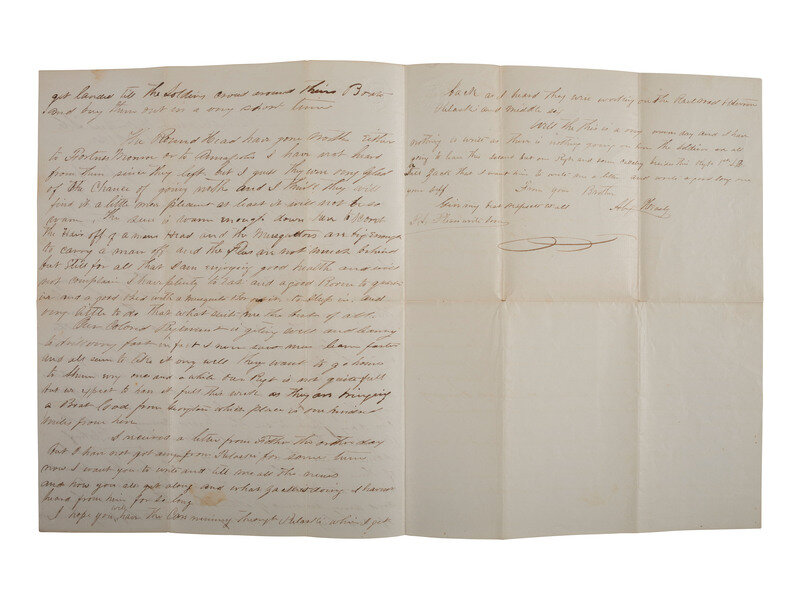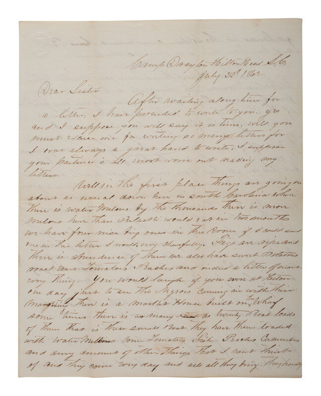 "Camp Drayton Hilton Head S.C.," 23 July 1862. 2 1/4 pages, 7 3/4 x 9 3/4 in., creased along folds, minor spotting and ink smearing.