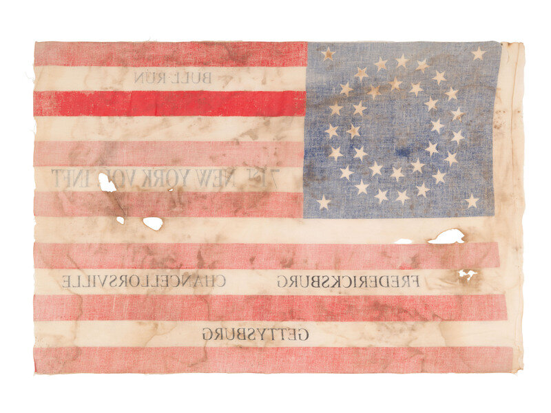 15 3/4 x 24 in. printed cotton flag with 35 stars configured as a double medallion, flanked by a star in each corner. Overprint identifies the flag to the "71st New York Vol. Inft." and documents Civil War battles: "Bull Run / Fredericksburg / Chancellorsville / Gettysburg."