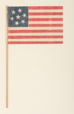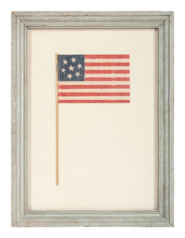 3 1/2 x 5 1/2 in. printed gauze flag, with central star surrounded by a circle of 6 stars, attached to original stick. Framed, 16 x 12 in. overall. Ca 1861-1890s.