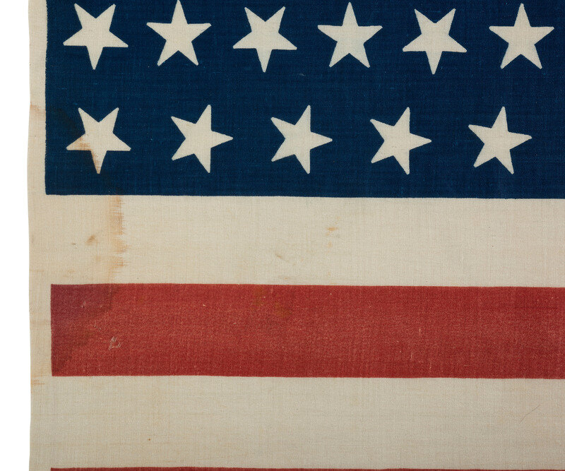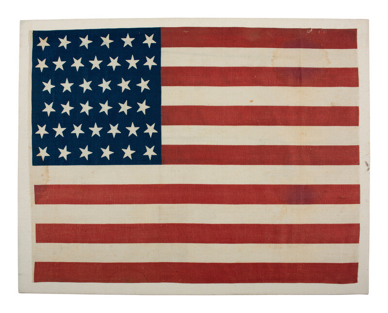25 x 32 1/2 in. flag printed on cotton, 38 stars configured in horizontal rows 6/7/6/6/7/6. Mounted on 27 1/2 x 35 in. board.