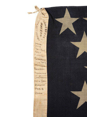 35 x 71 in. clamp-dyed wool flag, 44 stars configured in horizontal rows 8/7/7/7/7/8. The linen header bears stamp of London maker, "Piggolt Bros & Co Makers...London" and hand-inscribed in ink, "Lausanne, Genoa, Port Said, Aden Colombo, Singapore, Hong Kong, Manilla, Nagasaki, Honolulu, San Francisco, New York, Bordeaux, Paris, Berne."