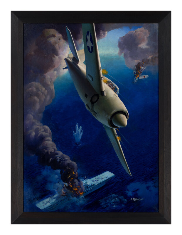 Alexander Leydenfrost was a Hungarian-American industrial designer and illustrator whose artwork during the Second World War brought the immediacy and drama of the conflict into the homes of millions of Americans. Throughout the war he produced dozens of images of American military prowess for Esquire magazine; this work was reproduced on page 95 of the September 1942 issue. The Grumman F4F Wildcat was for a time the only effective fighter available to American forces in the Pacific Theater, however it was often outperformed by the Imperial Japanese Navy's Mitsubishi A6M-Zero, leading to its eventual replacement by the Grumman F6F Hellcat.