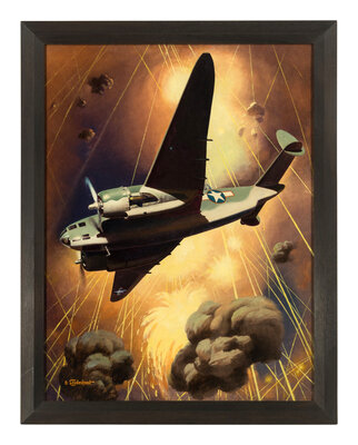 Alexander Leydenfrost was a Hungarian-American industrial designer and illustrator whose artwork during the Second World War brought the immediacy and drama of the conflict into the homes of millions of Americans. Throughout the war he produced dozens of images of American military prowess for Esquire magazine; this work was reproduced on page 89 of the February 1944 issue. The Lockheed PV-1 Ventura was specially made for the United States Navy for use in the Pacific Theater, with its most important addition being its ASD-1 search radar.