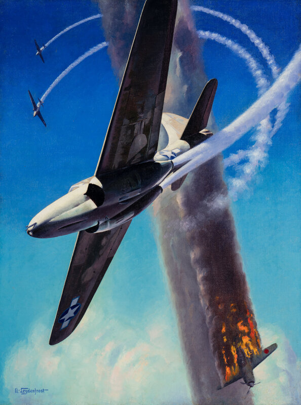 Alexander Leydenfrost was a Hungarian-American industrial designer and illustrator whose artwork during the Second World War brought the immediacy and drama of the conflict into the homes of millions of Americans. Throughout the war he produced dozens of images of American military prowess for Esquire magazine; this work was reproduced on page 91 of the March 1945 issue. The P-59 Airacomet was manufactured by Bell Aircraft, and was the first jet built in the United States. Though its design was impressive the engine was underpowered and so it never saw combat during the war.