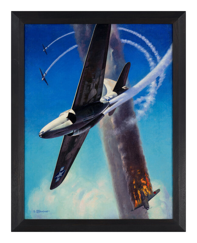 Oil on canvas of a P-59 Airacomet spiraling through the sky as a flaming jet crashes towards the sea signed by Leydenfrost at bottom left (some light cracks and abrasions). Visible area 29 × 22 in. Frame: 32 1/4 × 25 1/4 in. Provenance: A Private Collection.