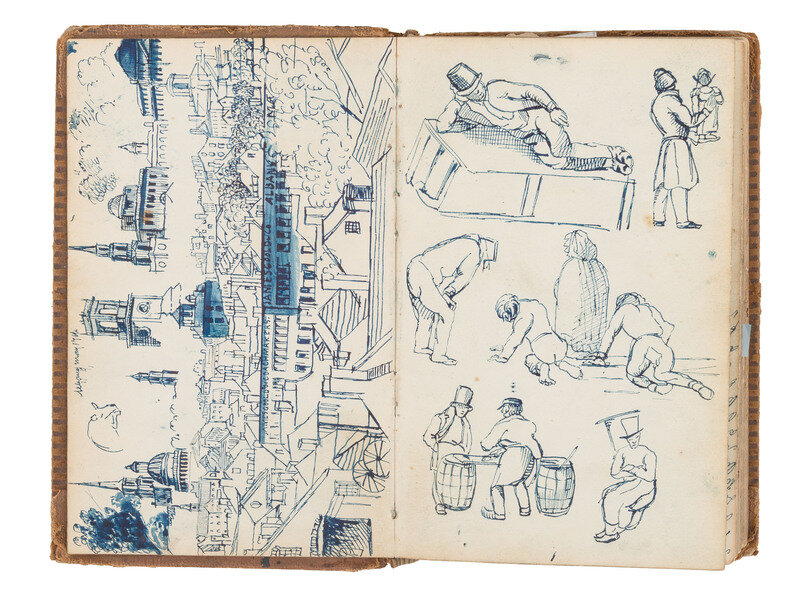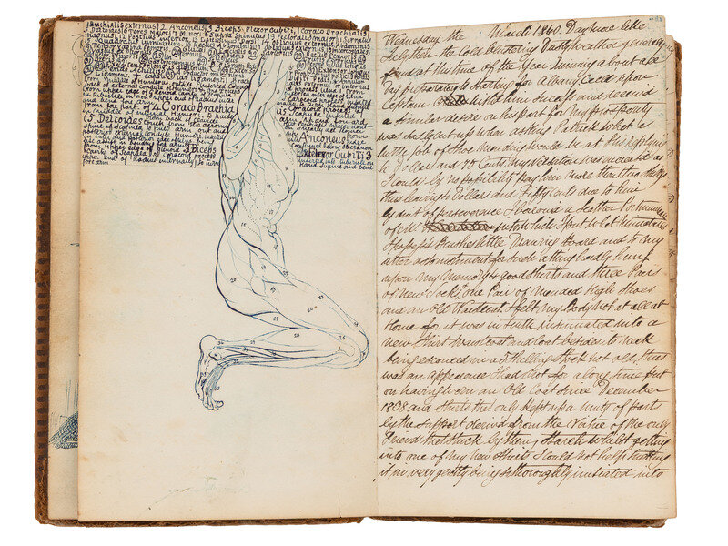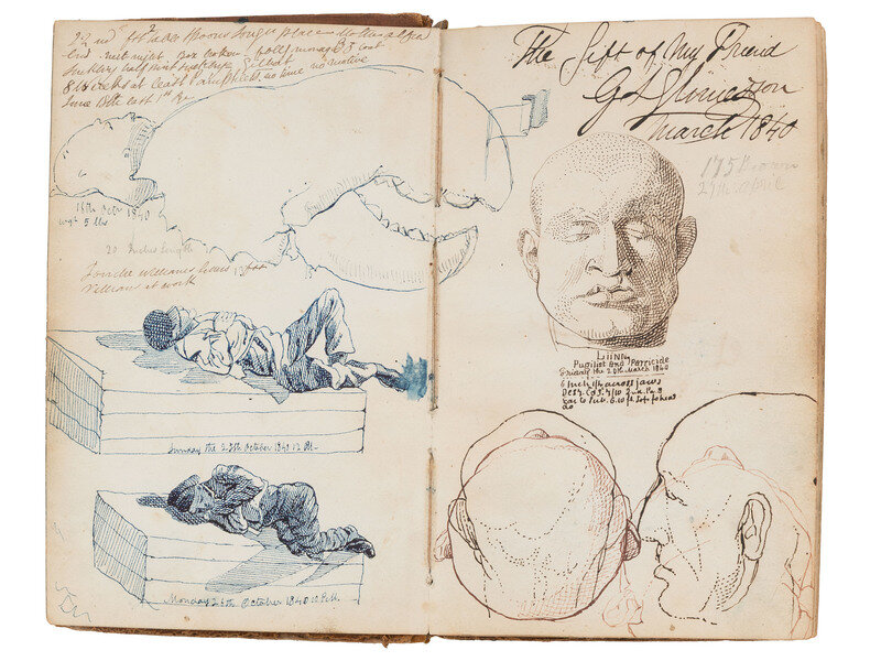 (New York) ca. March through November, 1840 (gap in dates from March 10- April 16). 8vo. Unpaginated, but approx. 220 pp, in blue, black, or red ink. Manuscript diary of an unidentified traveling portrait artist and daguerreotypist in New York City, as well as the surrounding area. Early leaf inscribed "A Gift of My Friend G.S. Sliveson(?) March 1840." Some pages with words and names scribbled out or redacted, some pages marked "Examined" at bottom margin. Full brown leather, tooled in blind, black morocco spine label stamped "records", boards and extremities worn and rubbed; front and rear prelims featuring elaborate color ink sketches, including men or women in various poses, diagrams of human skulls, some with a phrenological emphasis, the human brain or other body parts, and more, glossed manuscript notes or other observations.