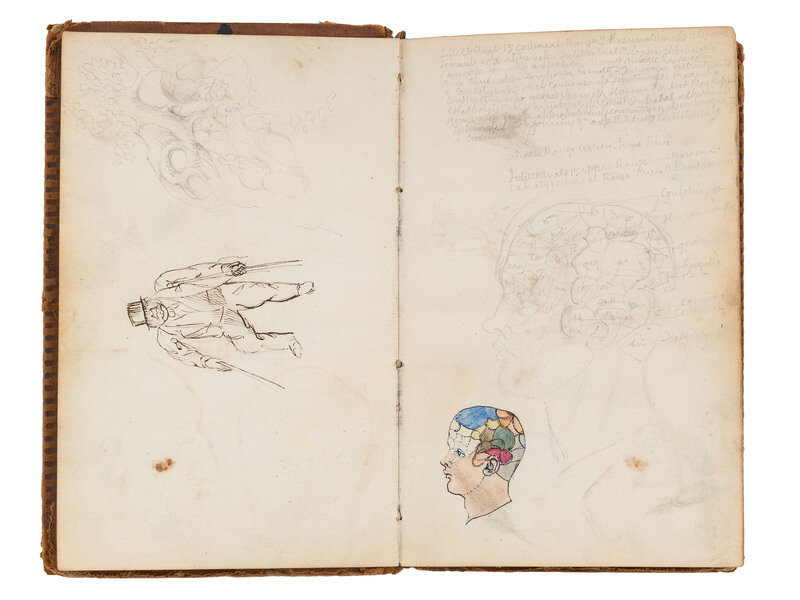 Many of the illustrations in the front and rear of the diary appear to be related to phrenology, including a profile view of a man's head, with numerous sections labeled with phrenological terms for various brain "organs" and the faculties for which they are responsible including "conforming," "human range," "governing," "establishing," and others. Another page includes highly detailed and beautifully shaded anatomical sketches of the human brain, from a number of angles.