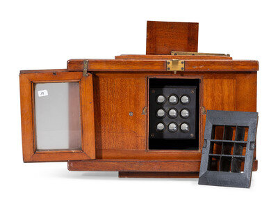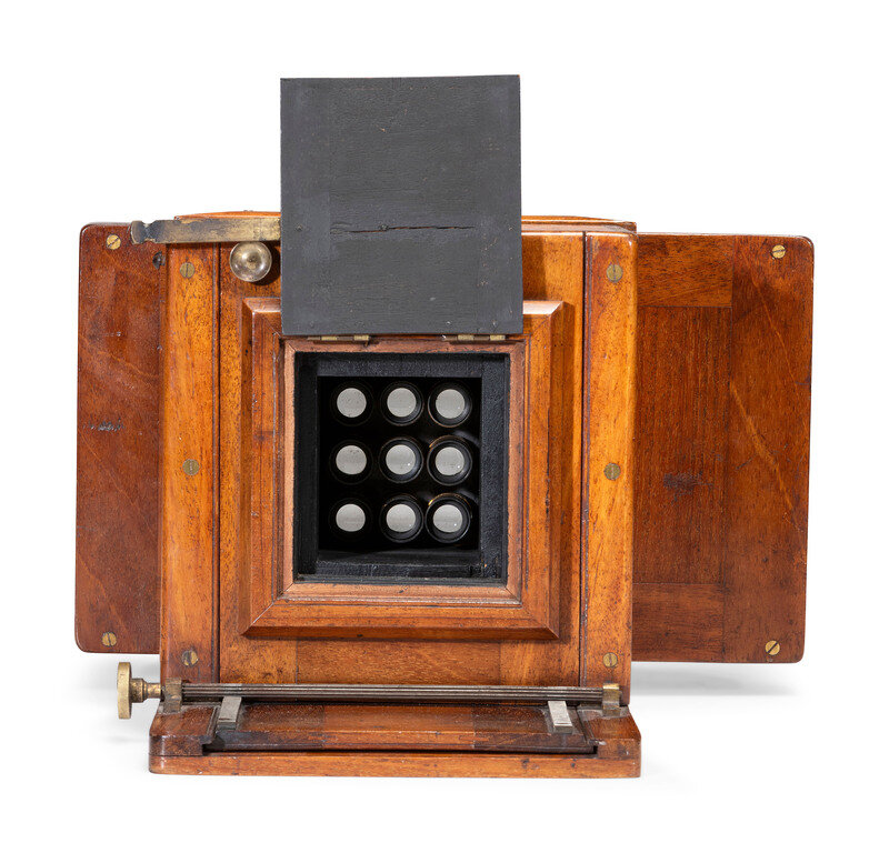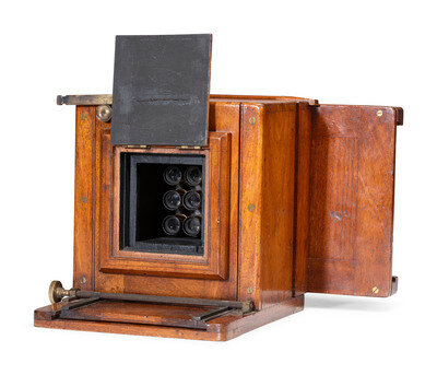 [EARLY PHOTOGRAPHY]. Wet plate, 9-lens camera. Fallowfield, London, ca 1890.